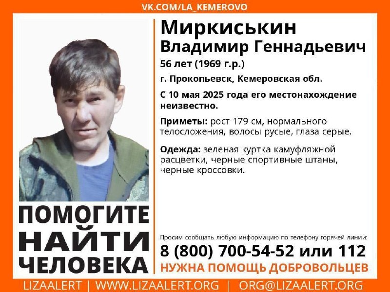🔍🔎🔦В Прокопьевске пропал Миркиськин Владимир Геннадьевич, 56 лет.