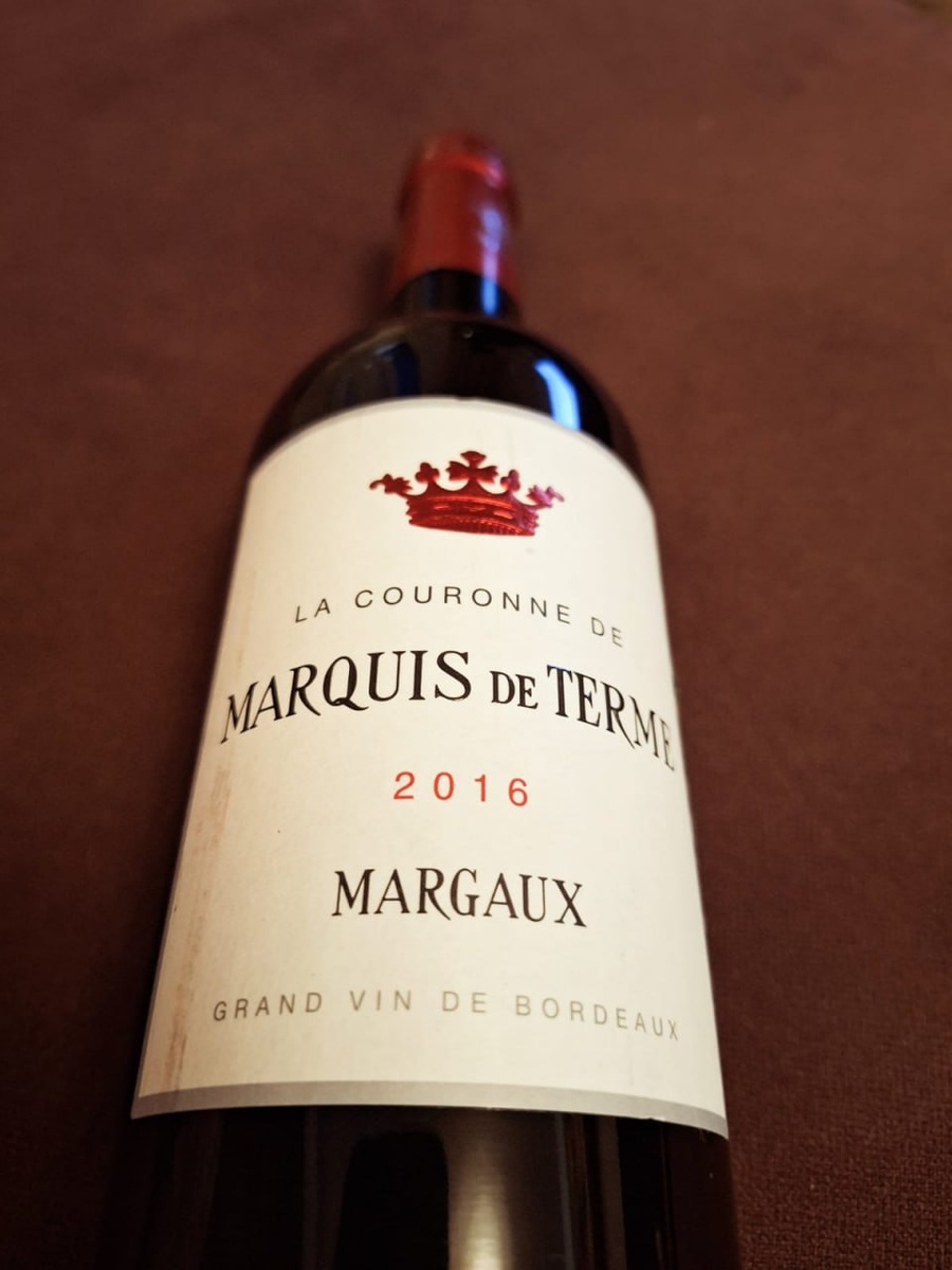 Château Marquis de Terme - Couronne de Marquis de Terme Margaux 2016 Вторая линия от хозяйства имеющего в Марго статус Гран Крю. Лично я пока не дорос до того, чтобы покупать их вина из первой линии - просто пока ментально не готов тратить на бутылку вина 120-150 евро, сколько они хотят за первую линию. Тем более что вторая линия, купленная на распродаже в Мираторге годика полтора назад за 2000 рублей, очень даже хороша. Внутри бордобленд в составе каберне-совиньон, мерло и пти вердо. Вино взрослеет 18 месяцев в дубовых бочках из которых половина новых, а половина старых. Это сочетание смягчает дут и делает его ноты не столь яркими, как если бы все бочки были новые. Очень округлый вкус, мягкая текстура, ноты бочки и фруктовые переплетены в единое целое. Танины сглажены, что неудивительно в таком возрасте. В единое неразрывное целое замешаны вкусы шоколада, сливы, черники, дуба с оттенками кожи и черного перца. Очень хорошо! Вообще в описании вина говорится, что потенциал хранения до 1