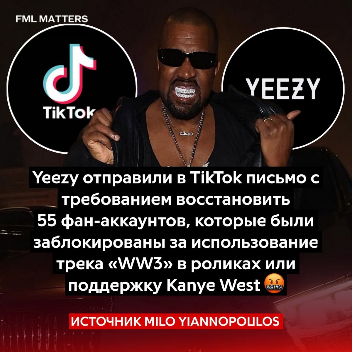 🚫 KANYE WEST ОБРУШИЛСЯ НА TIKTOK! Письмо от бренда Йе — Yeezy было адресовано в TikTok с требованием восстановить 55 фан-аккаунтов, которые были заблокированы за поддержку Йе или использование трека «WW3» в своих роликах. В письме говорится, что блокировки были массовыми, необоснованными и нанесли ущерб бренду и фанатам Йе. Компания требует объяснений и восстановления аккаунтов в течение 48 часов. 💀 FML MATTERS