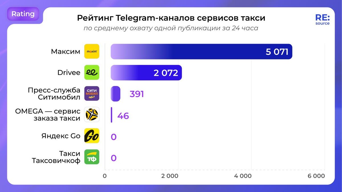 🔹🔹🔹 Канал Максим — самый охватный среди сервисов такси в Telegram Это ожидаемо: у него 44 тысячи подписчиков, в то время как у его ближайшего конкурента по охвату и лидера рейтинга по репсота, канала Drivee, 13 тысяч. А вот у канала Яндекс Go охватов нет совсем — все потому, что в декабре 2024 года там перестали выходить посты. При этом TGStat показывает, что репосты из канала все еще идут. Рейтинги Telegram-каналов из других сфер: 📚Книжные магазины 🛎Сети отелей 💉Медицинские лаборатории Источник: TGStat #TGrating Подписаться на RE:source