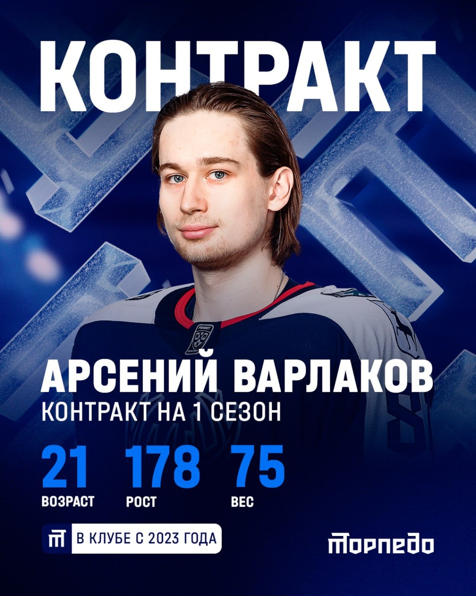 21-летний защитник 🦌 Арсений Варлаков подписал новый двусторонний контракт с «Торпедо» сроком на один год. В прошедшем сезоне Арсений демонстрировал не только надежную игру в обороне, но и бомбардирские навыки при подключениях к атакам. В составе «Торпедо-Горький» он заработал 25 (6+19) баллов в системе «гол+пас». Особенно запомнились болельщикам его шайбы в плей-офф, становившиеся для команды победными. В частности, в овертайме седьмого матча со «Звездой» и в шестой игре серии с «Химиком». Желаем продуктивного нового сезона и множества позитивных эмоций на хоккейных площадках страны!