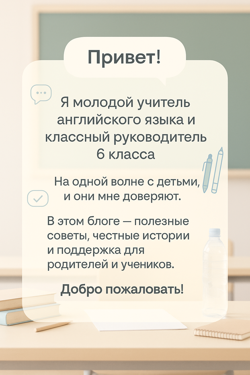 Привет! Меня зовут Валерия, я молодой учитель английского языка и классный руководитель 6 класса. Работаю с детьми от 2 до 9 класса — учу их не только иностранному языку, но и помогать, слышать, думать и быть собой.Я на одной волне с детьми. Мне близки их интересы, тревоги, вопросы. Они чувствуют это — и часто доверяют мне гораздо больше, чем просто учителю. Иногда я слышу: «Вы как старшая подруга», «Вы понимаете, как мы думаем». И это самое ценное.В этом блоге я хочу делиться тем, что действительно работает: — как помочь ребёнку полюбить учёбу, — что делать, если он «ничего не хочет», — как родителям сохранить контакт с детьми и не выгорать. Я — не теоретик. Каждый день вижу, как живут дети и взрослые в современной школе. Радуюсь их успехам, ищу решения вместе с родителями, поддерживаю, когда трудно.Писать сюда — моя попытка сделать школу местом понимания и уважения. Без криков, нотаций и вины.Если вы родитель, педагог или просто человек, которому важно, чтобы дети росли в здорово