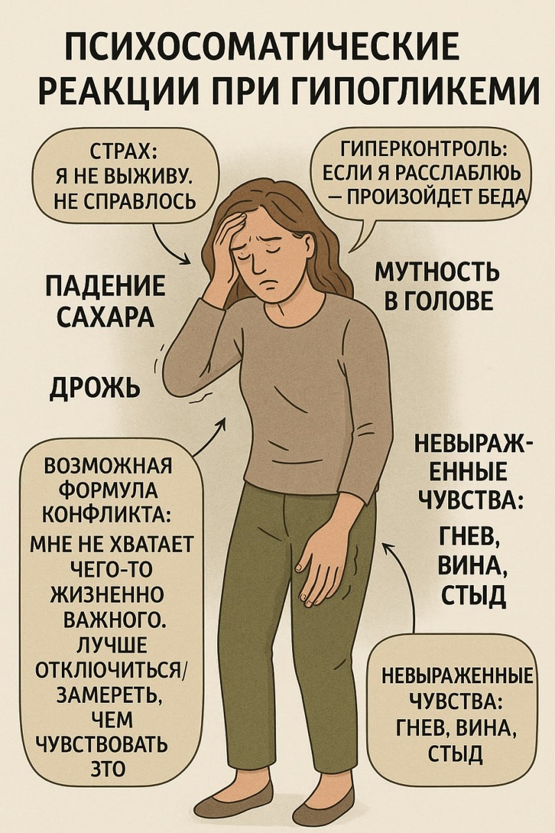 Здравствуйте Олег, у меня часто падает сахар, появляется дрожь в руках и теле , мутнеет в голове, немеет правая рука и нога. Интересно узнать психосоматику данного состояния. Здравствуйте! То, что вы описали — периодическое падение сахара в крови (гипогликемия), сопровождающееся дрожью, онемением конечностей, мутностью сознания, — с точки зрения психосоматики может быть рассмотрено как комплексный биологический ответ на определенные внутренние конфликты. Давайте разберем возможные глубинные причины на базе Германской Новой Медицины. Согласно ГНМ, снижение сахара может быть связано с конфликтом голода, но не в буквальном, а в символическом смысле: - Голод по любви, теплу, вниманию; - Невозможность «переварить» стресс, требующий срочной реакции; - Тема лишения, страха не выжить, утраты ресурса (часто в детстве или во внутриутробном периоде). Это может быть наследие программирования — если в семье или в роду был опыт голода, дефицита, то мозг «отрабатывает» этот биологический страх, даже