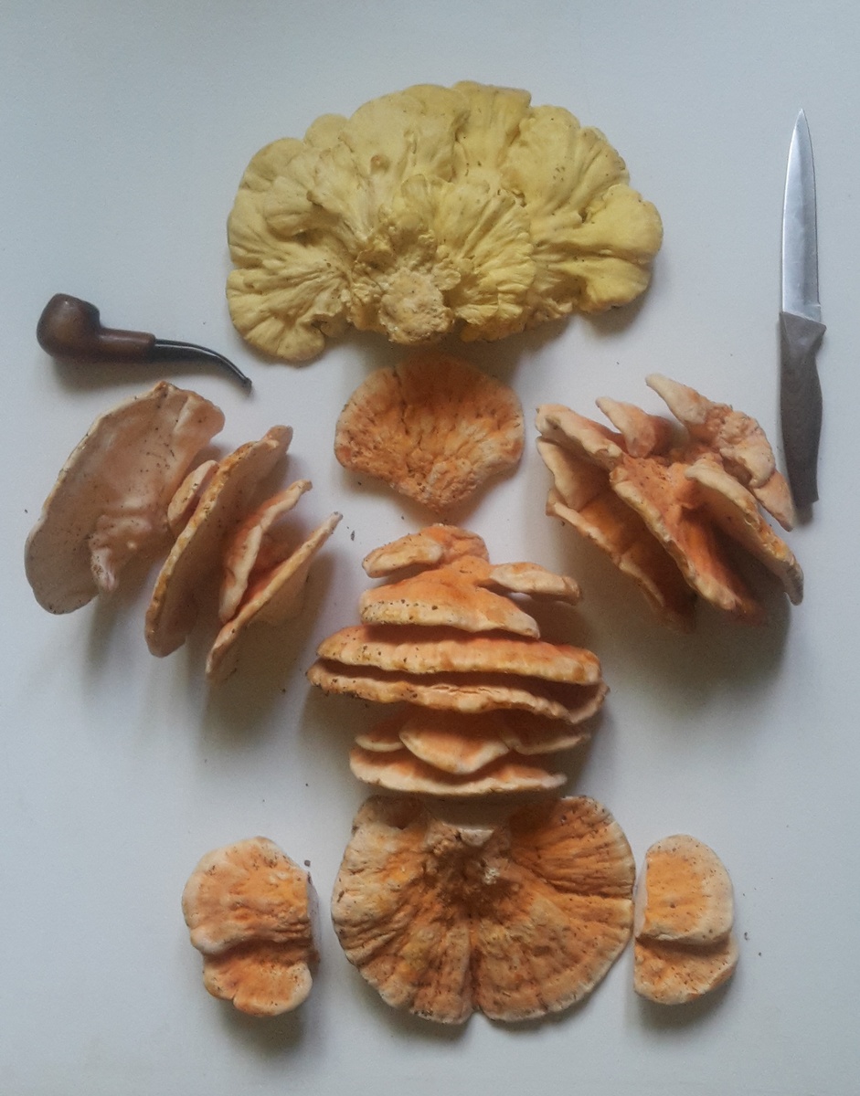 Риторическая трепология «срезать или выкручивать» применительно к ТСЖ лишена всякого смысла: вырвать его можно разве что вместе с деревом. А вот на срез надо посмотреть внимательно: в отличие от лисичек этот жёлтый гриб очень даже бывает червивым. Кстати, если срезать плодовое тело не целиком, то оставшаяся часть продолжит бурный рост. Первый ТСЖ этого года я нашёл неожиданно рано, 20 мая, ещё до комаров (в прошлом году отказался от сбора трутовиков именно из-за полчищ гнуса). Странным показалось, что «разродилось» только одно полено, на других известных «точках» (а ТСЖ, как и зимние опята, прописку не меняют) не было признаков жизни. Ну да у меня с прошлых лет ещё не распечатаны несколько банок с маринадом и одна грибного варенья. А на сковородку с картошкой хватило единственного свежего экземпляра (даже «бутончики» оставил на вырост).