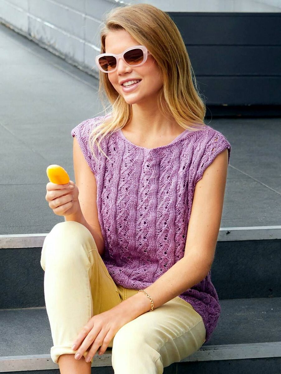 Этот сиреневый топ доказывает, что изысканность не обязательно должна быть синонимом роскоши. Сплошной ажурный узор создает захватывающую текстуру, не будучи чрезмерно навязчивым. Широкий вырез лодочкой, прямой крой без пояса и, наконец, модный цвет лаванда придают этому воздушному топу модный характер. Вырез лодочкой отделан рядом соединительных стежков, чтобы придать ему некоторую структуру. Отличная летняя смесь из хлопка, льна и вискозы — из такой пряжи будет и вязать приятно, и носить комфортно.