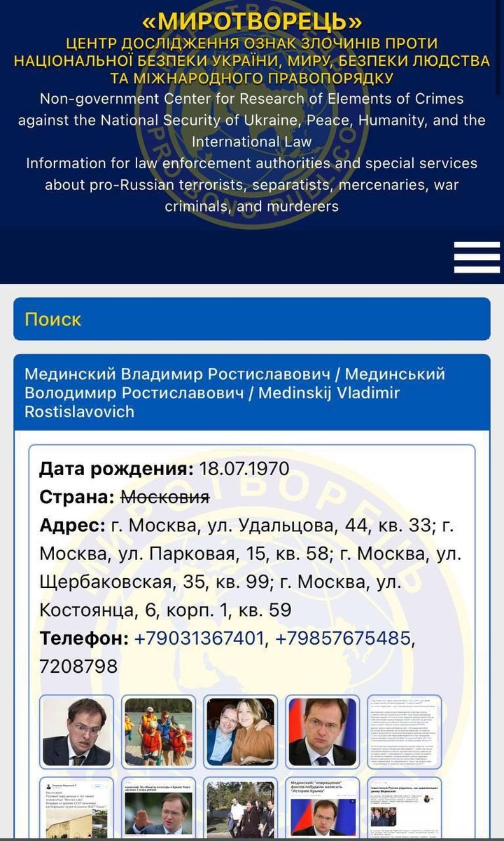 Украина внесла помощника президента Российской Федерации Мединского на «Миротворец» Помимо его личных данных, там указана информация о его жене, детях, отце и сестре. Die Ukraine hat den russischen Präsidentenberater Medinsky zu „Peacemaker“ hinzugefügt. Neben seinen persönlichen Daten gibt es Informationen zu seiner Frau, seinen Kindern, seinem Vater und seiner Schwester.