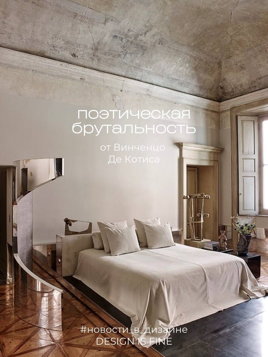 Поэтическая брутальность от Винченцо Де Котиса В интерьере своего миланского дома — апартаментах в палаццо XVIII века, всемирно известный дизайнер снова играет на контрастах фактур и смешении стилей: грубые стены и бережно очищенные от наслоений исторические фрески соседствуют с современными предметами его авторства. Де Котис — пионер в использовании переработанных материалов. Он сочетает их с благородными элементами: латунью, мрамором, муранским стеклом. «Мне нравится сталкивать богатые и бедные фактуры. Это подлинная роскошь!» Интерьер буквально напичкан произведениями Винченцо: панно в гостиной над камином — из старых радиаторов, светильники из латуни и цветного стекла, столы, консоли, диван, кровать, арт-объекты, — всё спроектировано им. Дизайнер мастерски вписывает винтаж и произведения других авторов: белое остроконечное панно в гостиной — работа немецкого художника Ф. Баудрекселя. В центре внимания столовой — стол из посеребренной латуни с элементами переработанного стек