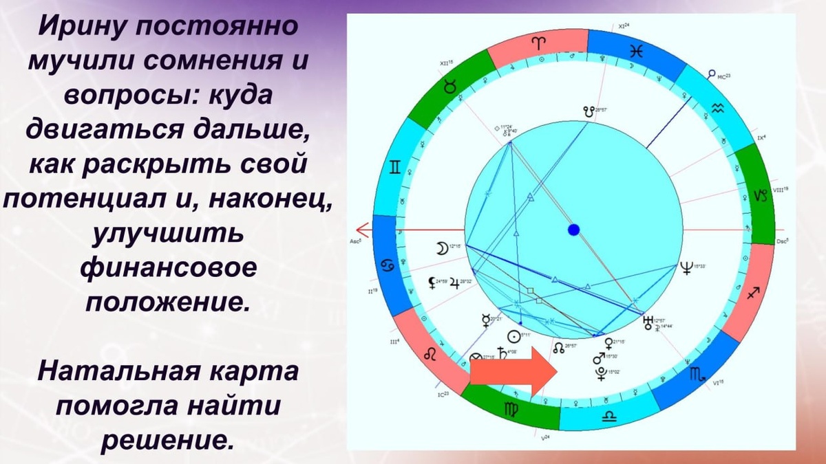 ✨ Дорогие Друзья! Я начинаю делиться с Вами историями из своей практики — историями, которые подтверждают, что астрология действительно может стать отличным помощником и эффективным инструментом для изменения жизни. 💫 Сегодня расскажу об Ирине — женщине, которой звёзды помогли найти своё призвание и вернуться к жизни. 1️⃣Когда Ирина впервые пришла ко мне на консультацию, она находилась в тяжёлом состоянии: постоянная усталость, ощущение пустоты, депрессивные мысли. Она честно призналась, что работа бухгалтером больше не приносит ни удовлетворения, ни смысла. Каждый день казался похожим на предыдущий — механический, выматывающий и эмоционально глухой. Она чувствовала, что живёт не свою жизнь, но не понимала, куда двигаться дальше. 2️⃣Изучая её натальную карту, я сразу обратил внимание на сильнейший акцент в 5 доме. Венера, Марс и Плутон в соединении в Весах (стеллиум планет) — мощнейший творческий потенциал, сочетающий эстетику, энергию и внутреннюю трансформационную силу. Там же на