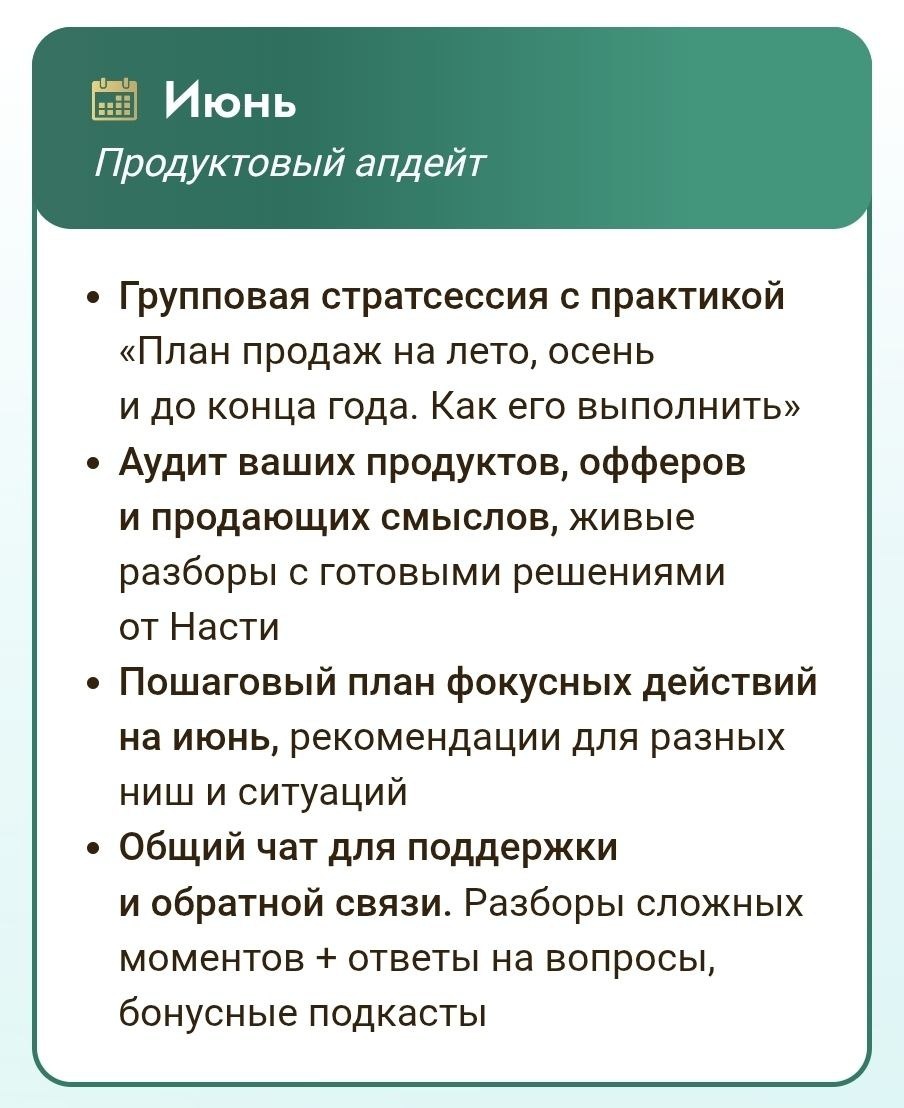 Смотрю на программу и в огромном предвкушении, как мы с вами будем всё реализовывать 🔥 Здесь мой стратегический мозг поразвлекался на славу) Июнь - "Продуктовый апдейт" Июль - "Трафик - свежая кровь" Август - "Стратегия 2025-2026" Внутри каждого месяца - оригинальные практики, мастермайнды, задания, челленджи, аудиты и разборы. Не исключено, кстати, что это не финальная версия, и я в момент вдохновения ещё чего-нибудь добавлю - я такая ——— Очень люблю наши недорогие форматы, вот честно. За то, что их могут себе позволить абсолютно все. Это правда доступные продукты. За то, что при небольшой стоимости эффект от внедрения кратно превышает цену. Потому что чёткая методология, структура, системный подход. Так и здесь: готовые решения, собранные по проверенной логике. Не надо придумывать пятое колесо: просто взять и повторить. Ещё и в тёплой компании единомышленников. Плюс, супер приятная цена. Вы с нами? 😉 https://adekvat-marketing.ru/focus
