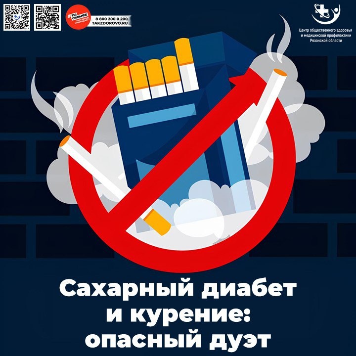🚭 Идёт неделя отказа от табака! Курение + диабет = опасный дуэт Если у вас диабет и вы курите, это вдвойне опасно: 🔥 Никотин: • Повышает уровень глюкозы в крови → сложнее контролировать диабет • Увеличивает инсулинорезистентность 💔 Сосуды под ударом: • Риск инфаркта и инсульта вырастает в 3 раза • Ускоряет развитие диабетической стопы и нефропатии Хорошая новость: После отказа от курения: ✔ Уже через месяц улучшается чувствительность к инсулину ✔ Через год риск осложнений снижается на 30-50% Бросить курить при диабете – не просто важно, а жизненно необходимо! 💙 #НеделяБезТабака #ДиабетБезСигарет #здоровоебудущее #здоровоебудущее62 #ЗдороваяРязань 👉 Поделитесь с теми, кому это важно!