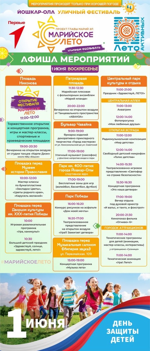 В Марий Эл 1 июня в четвертый раз начнется «Марийское лето» Уличный фестиваль был инициирован Главой Марий Эл Юрием Зайцевым. В этом году «Марийское лето» стартует 1 июня и будет насыщенным и разнообразным. Торжественное открытие фестиваля состоится в воскресенье, 1 июня, в 11 часов на площади им. В.П. Никонова. Зрителей ждут концерт, игры, мастер-классы, спортивные и краеведческие площадки. Активности ждут йошкаролинцев и гостей города на Патриаршей площади, бульваре Чавайна, в Центральном парке культуры и отдыха, Парке Победы и других площадках.