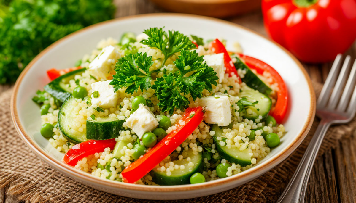 Салат из кус-куса с зеленым горошком и свежими овощами