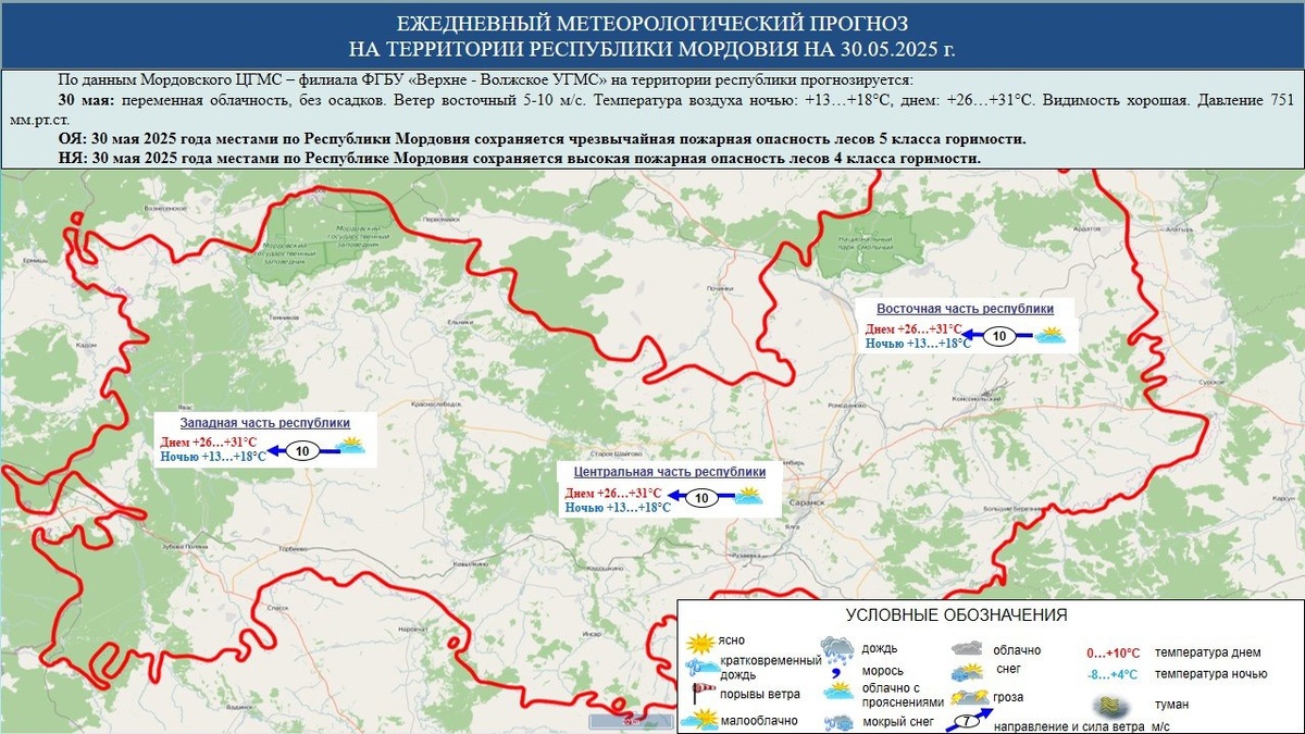 ☁️⛅⛈️ 30 мая в Мордовии переменная облачность, без осадков. Ветер восточный 5-10 м/с. Температура воздуха ночью: +13…+18°С, днем: +26…+31°С. Давление 751 мм рт. ст.