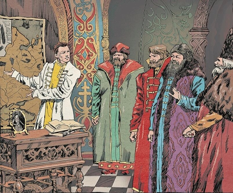 Иллюстрация: Лжедмитрий I и русские бояре. Художник Игорь Сакуров.