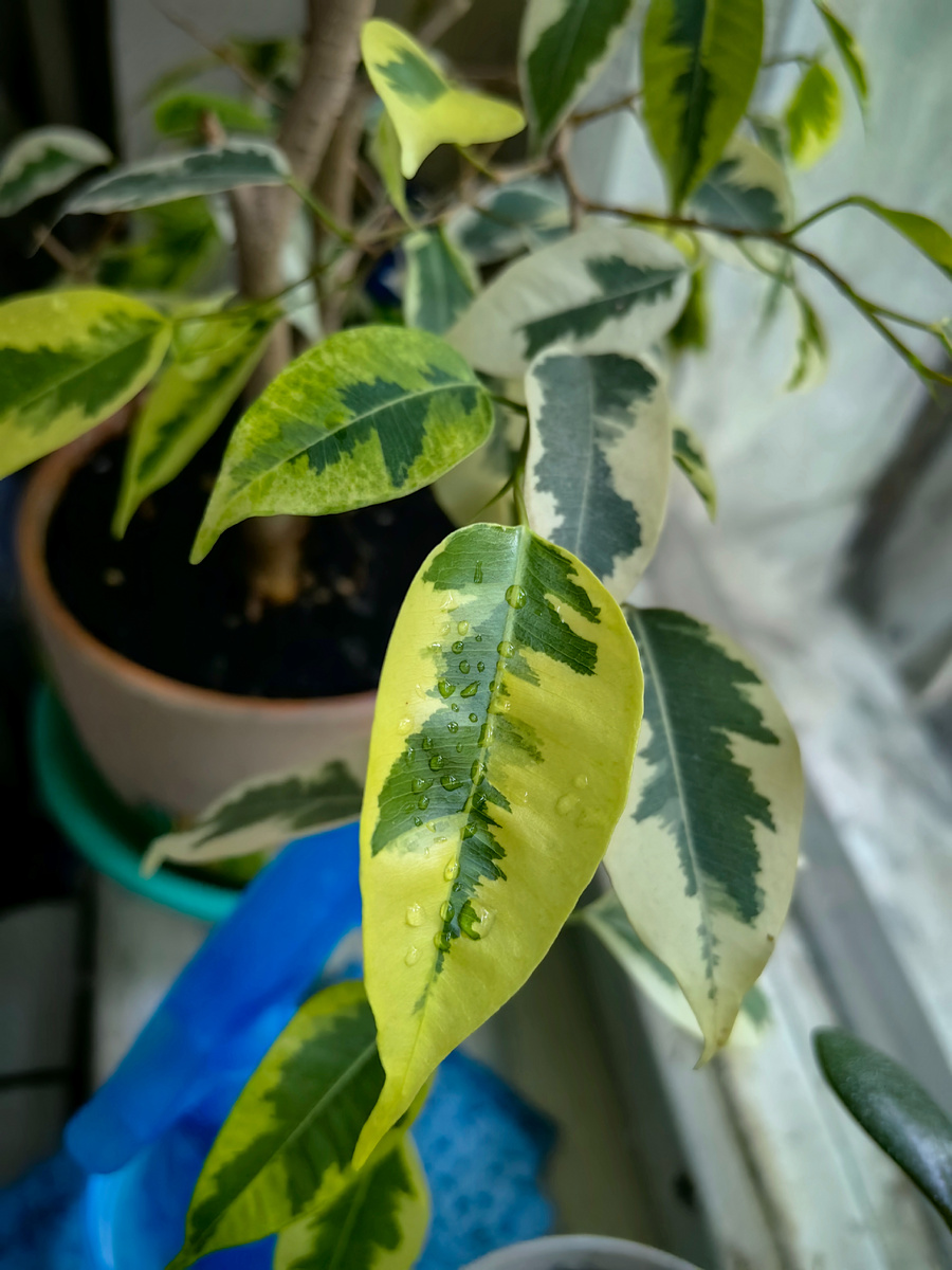 Ох уж эти фикусы... Чуть сдвинул и он тебе сразу листья скидывает. Именно такой капризуля достался мне от мамы в наследство. Я его поставила в угол и 5 лет не трогала вообще, только в душ мыться носила. Фикус разросся в высоту и стал полуоблезлым деревом и с этим нужно было, что-то делать. В итоге первого мая я решила привести все цветы в порядок, ну и его тоже. Обрезала просто варварски, оставила одну зелёную ветку, в высоту срезала наполовину. Срезанные ветки поставила в воду. Ну и заодно поменяла грунт и горшок, пусть уж сразу отпсихуется на всё. И... Он обиделся. Месяц из горшка торчали 2 голые палки с одной зелёной веткой. Думала всё, так и останется торчать как арт скульптура в честь моего не почтительного вмешательства. А сегодня я увидела на нем новые, совсем маленькие, веточки. Оклемался мой красавчик. Хожу весь день пшикаю его водичкой. Ну и срезанные ветки дали корни и я их подпихнула к основному в горшок. Легче всех обрезку перенёс каланзоэ Его подарил муж, он цве