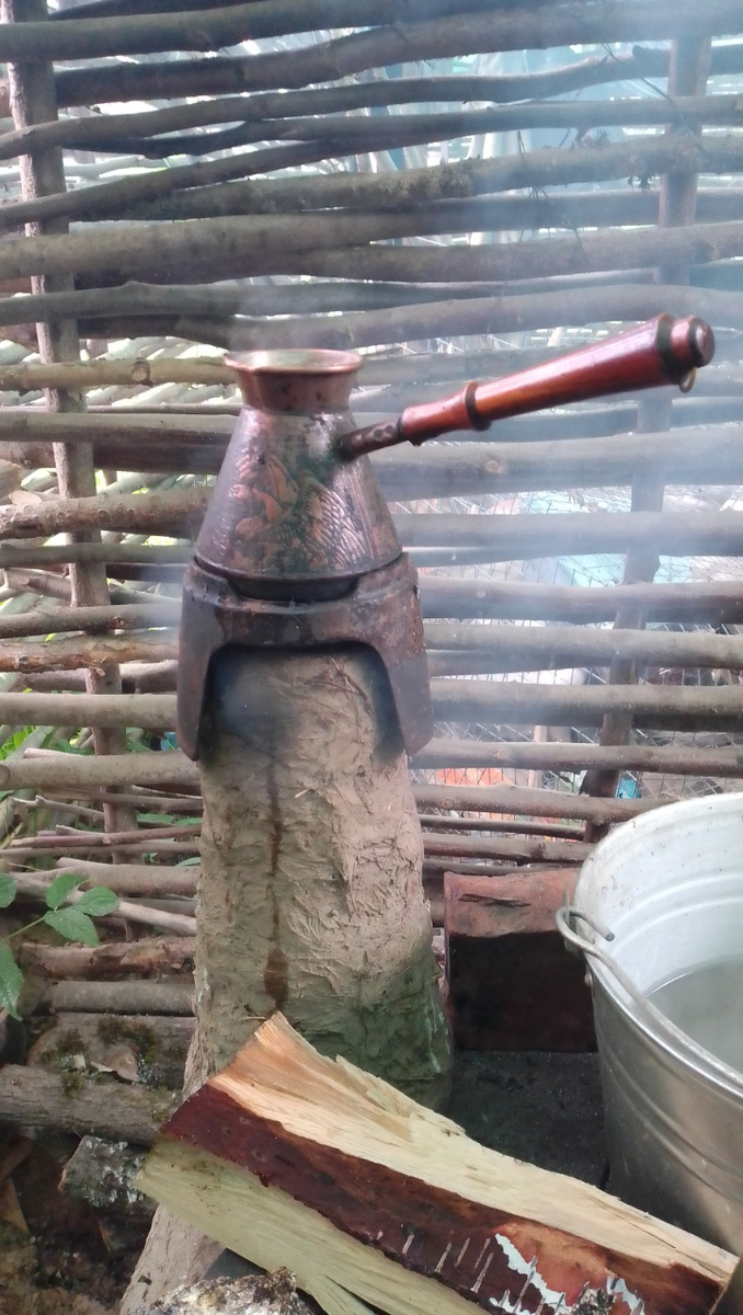 Давно эта штука у меня валялась - когда-то, перед переездом в деревню, подарили мне чугунную фондюшницу, она быстро треснула, и сейчас работает собачьей миской, ну а это подставка от неё. В прошлом году сложила под навесом в Летней Кухне печундру с низкой саманной трубой - эта подставка к ней подошла, теперь на трубе можно варить кофе, да и не только кофе. Ещё одна конфорка получилась.