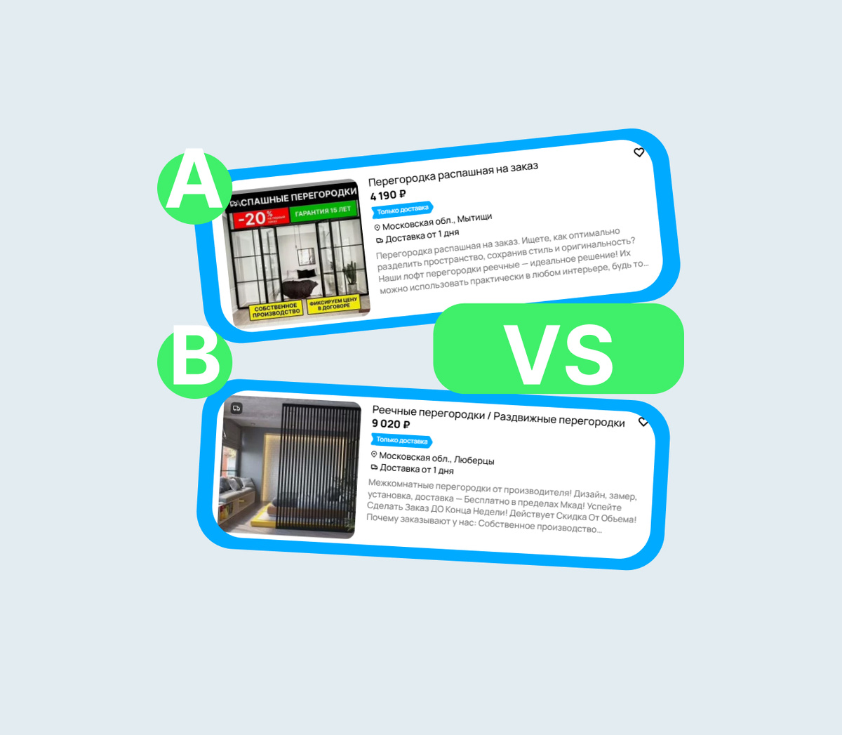 Обычно сравниваются два варианта (варианты A и B). Например, это может быть однотонная обложка в объявлении или же эффектный креатив, привлекающий внимание.