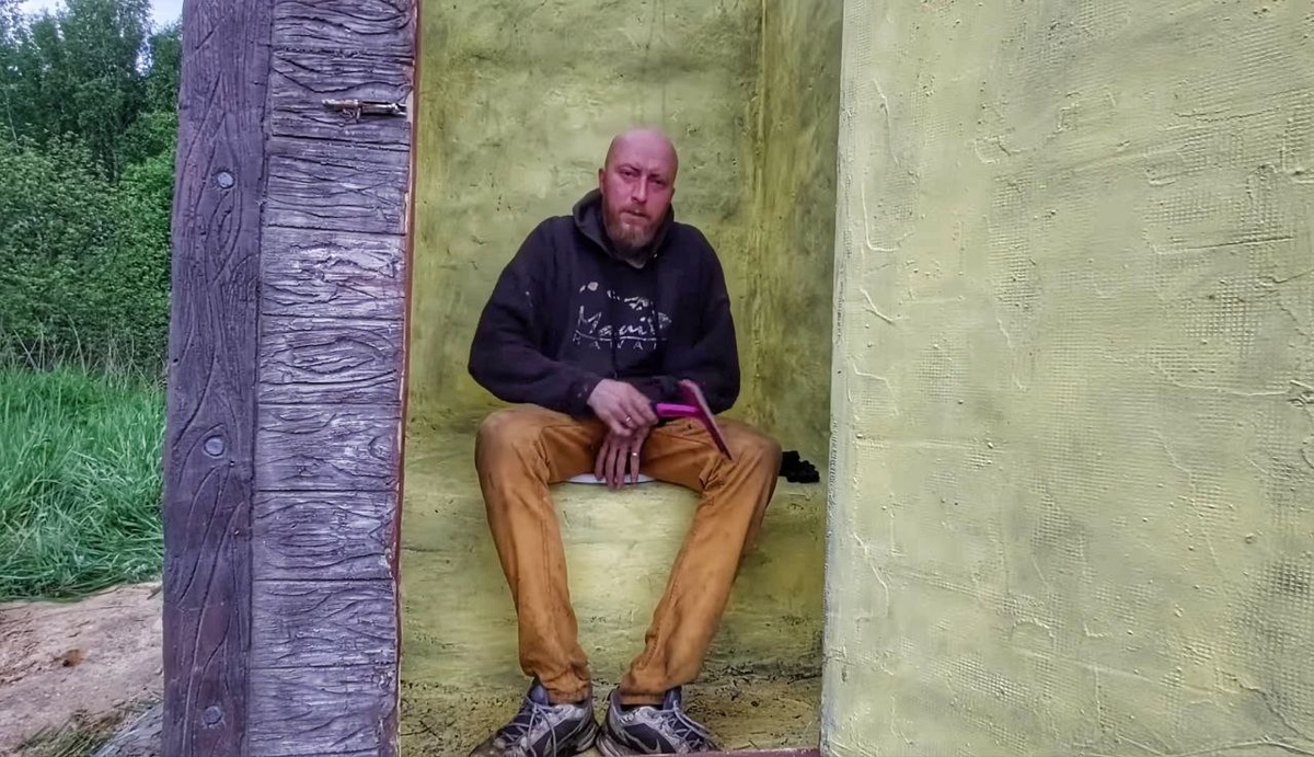 Я решил использовать экструдированный пенополистирол п нескольким причинам: лёгкость в работе, теплоизоляция, пожаробезопасность, экологичность и дешевизна. С использованием клея для теплоизоляции и стеклосетки мы получаем основание с технологическим отверстием для физиологических потребностей. Далее убедившись, что вертикальная сборка не уступает горизонтальной я начал смазывать торцы экструдированного пенополистирола пеной и скреплять их саморезами, чтобы при набухании стенки не расходились. Далее я вырезал отверстие под будущую дверь с отступом от краёв: горизонталь 250мм, вертикаль 300мм. А сама высота отверстия получилась около 2м. Потом я присверлил второй лист пенополистирола, для более крепкой конструкции и для лучшего крепления крыши. Дальше по той же схеме как и с основанием мы поступаем с внешними стенками туалета. Позже мы его переносим на место назначения с заранее выкопаной ямой. После этих действий я помазал по периметру смесью цемента с пропорциями цемента и песка
