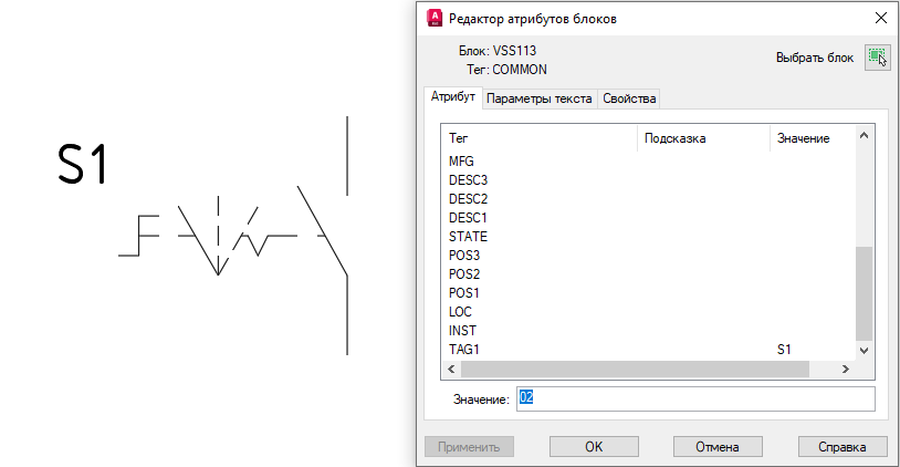 Как известно, компонент AutoCAD Electrical – это блок с атрибутами. Например, переключатель S1 на рисунке ниже - это блок VSS113 с определенным набором атрибутов. При создании новых записей в каталоге изделий (или редактировании существующих) можно ввести значения для атрибутов. Для размещенного на чертеже переключателя S1 выбираем команду Редактировать компонент. В диалоге «Вставить / Редактировать компонент» нажимаем кнопку Поиск. В Обозревателе каталогов выбираем каталожный номер, например, 800T-J17A и нажимаем на пиктограмму Редактирование базы данных каталога. «Обозреватель каталогов» переходит в режим редактирования (желтый фон). В поле «ТЕКСТ» вводим: State=XOX;POS1=СТОП;POS2=ВЫКЛ;POS3=ВКЛ, то есть: · Для атрибута «State» введено значение XOX · Для атрибута «Pos1» - значение СТОП · Для атрибута «Pos2» - значение ВЫКЛ · Для атрибута «Pos3» - значение ВКЛ Нажимаем кнопку Принять изменения и возвращаемся в режим выбора (фон белый). Выбираем переключатель 800T-J17A и нажимаем кнопку