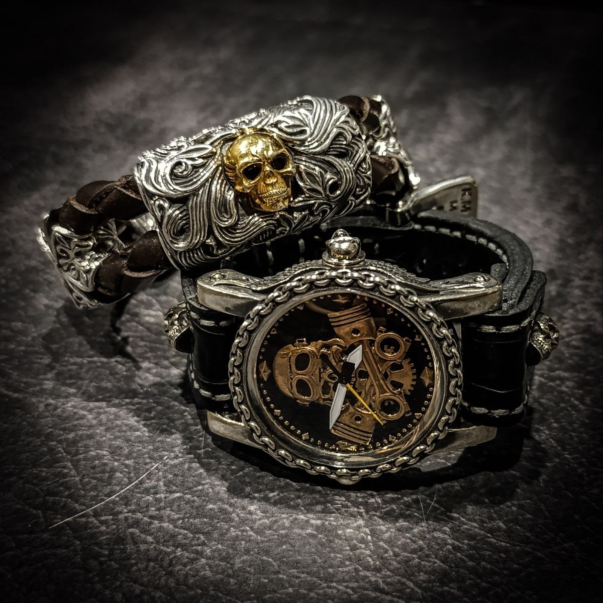 Новое исполнение одного из самых первых браслетов из нашей коллекции. Вместо рыцарского шлема, по просьбе заказчика, золотой череп с эмалью в глазницах. Эта пора аксессуаров, часы и браслет, отлично сочетаются на мужском запястье.