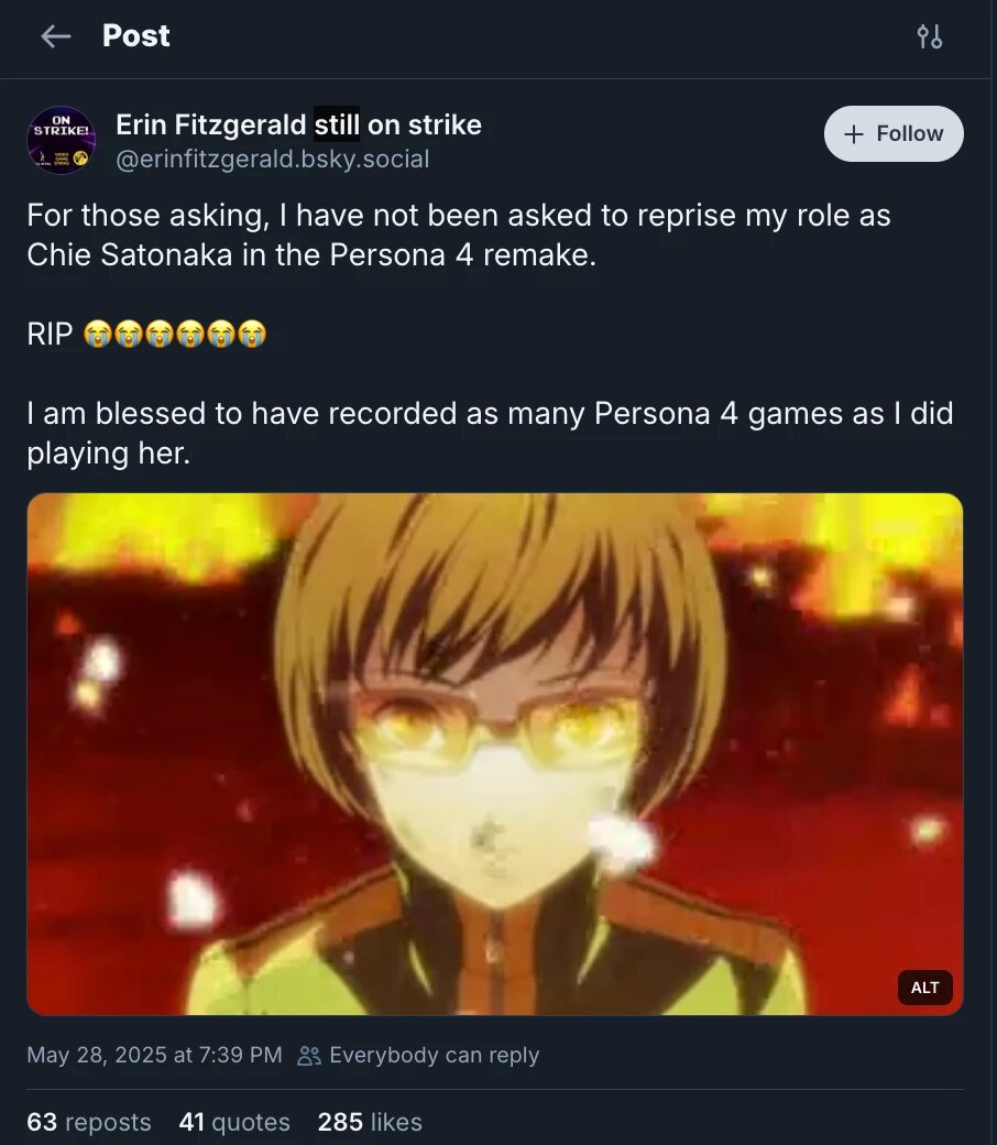 Эрин Фитцджеральд, актриса, озвучивавшая Чиэ Сатонаку, подтвердила на Bluesky, что не получала никаких известий от Atlus по поводу озвучивания персонажа в потенциальном ремейке Persona 4. Это произошло после того, как Юрий Ловенталь, озвучивавший Йоске Ханамуру, заявил, что не собирается возвращаться для потенциального обновления JRPG. В заявлении Фитцджеральд говорится, что с ней не связывались по поводу возможного возвращения персонажа в ремейк. Она также выразила радость по поводу возможности сыграть ее в тех частях и спин-оффах, которые она делала. Актер Юрий Ловенталь, который вчера написал о том, что Atlus не хочет его возвращения в ремек, уже удалил свое заявление из социальных сетей. Эрин Фитцджеральд — вторая английская актриса, подарившая свой голос Чиэ в серии Persona, она дебютировала в Persona 4 Arena. Затем Atlus поручила ей эту роль в выпуске Persona 4 Golden. Она также появлялась в ритм-играх, спин-оффах и аниме-адаптации. До этого Трейси Руни играла героиню в оригиналь