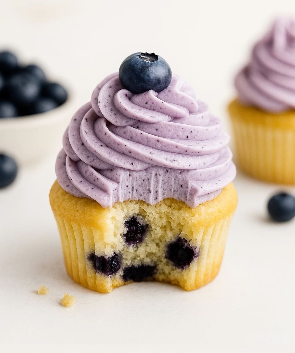 Мягкое ванильное тесто, сочная черника внутри и пышный ягодный крем Для теста: Для крема: Для декора: 1. Тесто: – Смешай яйцо, сахар, ваниль и молоко. – Добавь растопленное масло и перемешай. – Просей муку с разрыхлителем и солью, добавь к жидкости. – Вмешай чернику, предварительно обваленную в муке. – Разложи по формочкам и выпекай при 170 °C около 20–25 минут. Остуди. 2. Крем: – Сливочный сыр взбей с сахарной пудрой. – Добавь черничное пюре и сливки, взбивай до пышности. – Охлади крем перед отсадкой. 3. Сборка: – Отсадь крем на остывшие капкейки. – Укрась сверху ягодами голубики. 🍓 Совет от кондитера: Чтобы крем хорошо держал форму, убедись, что сливки и сыр хорошо охлаждены. А чернику для пюре можно слегка прогреть и протереть — цвет и вкус станут ярче.