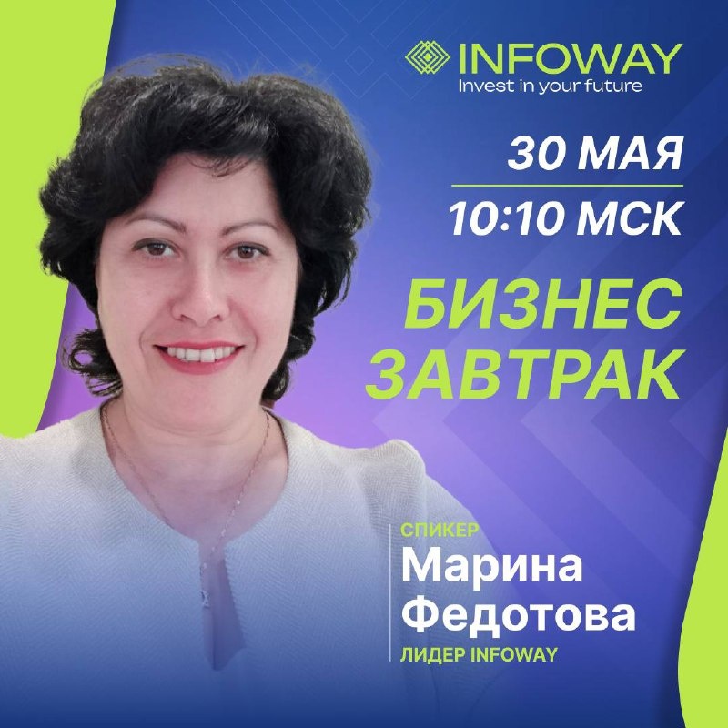 ⭐️БИЗНЕС-ЗАВТРАК: 30 МАЯ! Друзья, уже завтра вас ждёт бизнес-завтрак с Мариной Федотовой, лидером компании INFOWAY. Каждое утро мы стоим перед выбором – продолжать ждать «следующего раза» или сделать первый шаг прямо сейчас. Каждый день, когда вы откладываете важные решения, отдаляет вас от мечты. Не ждите лучшего времени, начните! Возьмите судьбу в свои руки и сделайте этот шаг навстречу вашему успеху. Мы ждём вас на бизнес-завтраке, где вы сможете зарядиться энергией, необходимой для достижения ваших целей.