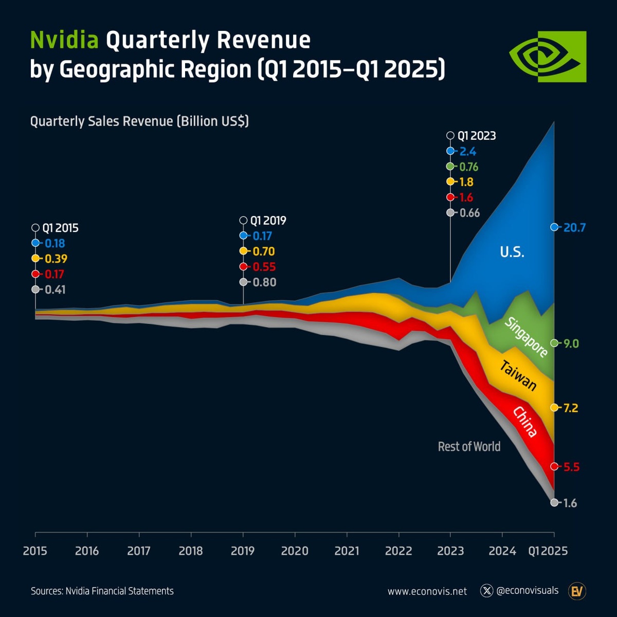 На втором месте — Сингапур ($9 млрд), далее следуют Тайвань ($7,2 млрд), Китай ($5,5 млрд) и остальные регионы ($1,6 млрд). За последние два года Nvidia фактически перешла на внутренний американский рынок, снизив зависимость от Китая и усилив фокус на контролируемых поставках чипов. Карта доходов компании наглядно демонстрирует, что геополитика и ИИ — это новый сырьевой рынок XXI века.