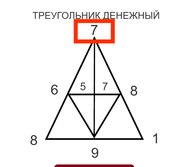 Смотри на вершину денежного треугольника ( дата вашего рождения сведенное к однозначному) в моем случает 1987 = 25 = 7 ( смотрим цифру 7)