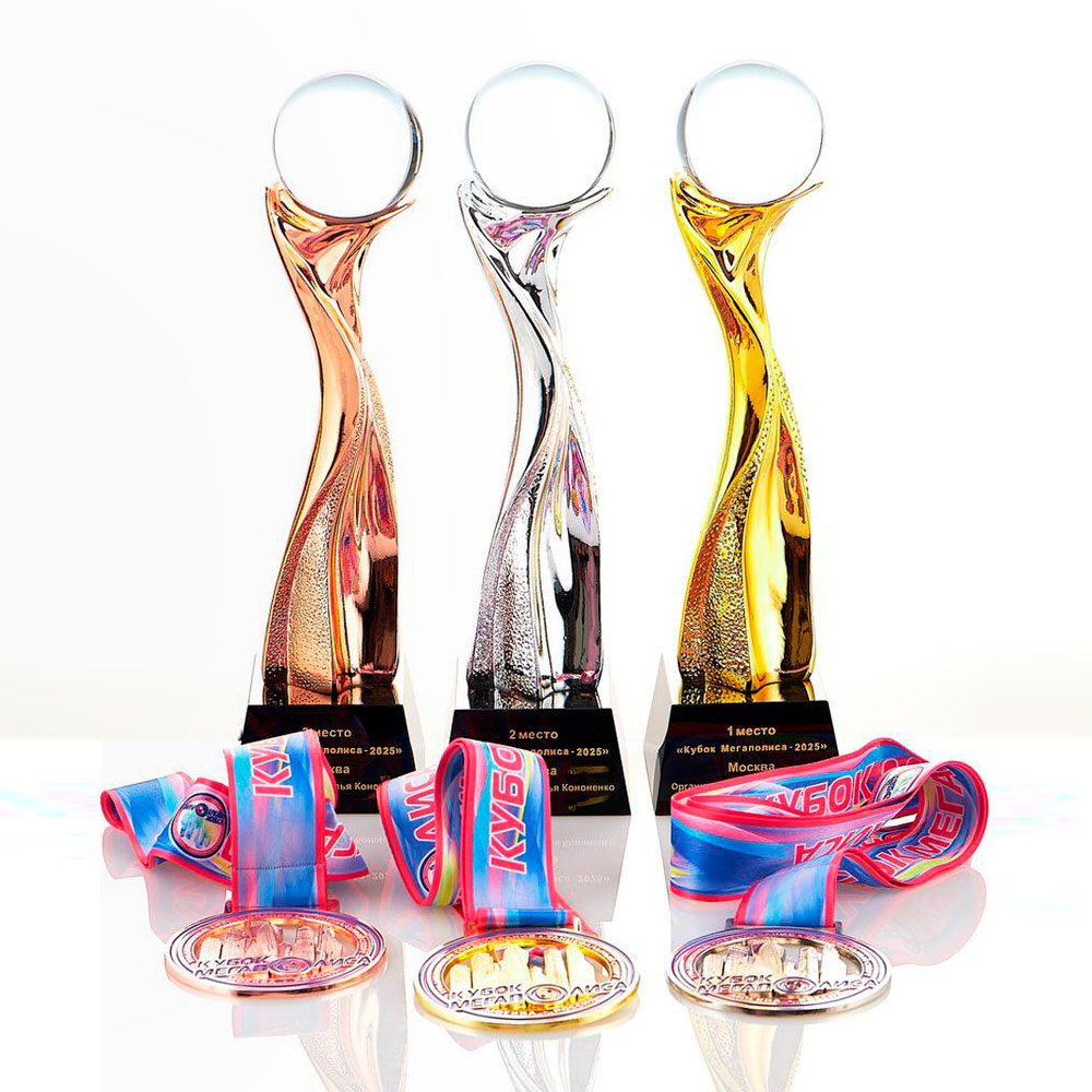 💎 Кубок. Кристалл МЕГАПОЛИСА. Открытые соревнования пар РСА. ➧ струящаяся вверх колонна в технике Crystal Art ➧ декор выполнен глянцевыми препаратами жидких золота, серебра и бронзы ➧ капитель лёгкая, воздушная, летящий ввысь стеклянный шар из натурального стекла, Art Deco ➧ кубки на 1-2-3 места высотой 28 см ➧ пьедестал кубка трапециевидной формы из натурального чёрного стекла ➧ атрибуты - золотая гравировка по стеклу. 🥇 Медали Кубка Мегаполиса. Призёры всех групп. ➧ уникальные авторские объёмные медали, металл, цветная эмаль ➧ диаметр – 80 мм ➧ основа – золотой, серебряный и бронзовый металл ➧ декор выразительный, престижный, многокомпонентный, с тонкими деталями ➧ форма круга с фигурной перфорацией металла ➧ аверс с атрибутами, логотипом “Кубка МЕГАПОЛИСА” в цветной эмали ➧ лента - выразительный цветной текстиль, рисунок яркий с надписью “Кубок Мегаполиса”. 🏆🥇 Награды «Кубка МЕГАПОЛИСА» — качественные и красивые трофеи — значимое украшение коллекции трофеев счастливого спортсм
