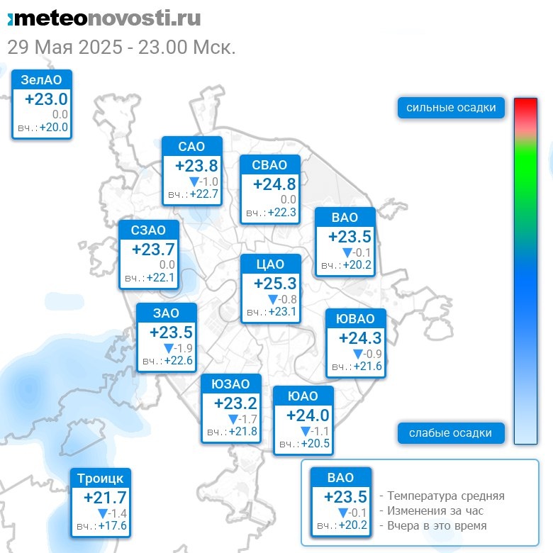 В 23:00 в Москве было от +22°C до +25.4°C, средняя температура +23.9°C #погода #Москва #весна #температура #29мая #четверг