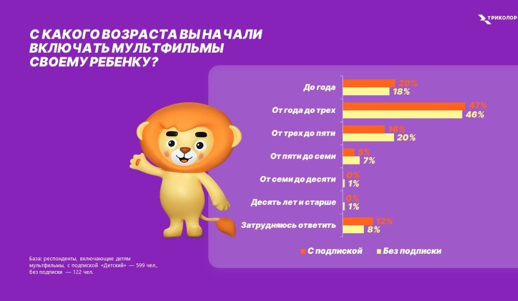 Ограничивают ли родители своих детей в просмотре мультфильмов, с какого возраста включают малышам сказки и на каких устройствах чаще всего показывают детский контент — специально ко Дню защиты детей «Триколор» провел тематический опрос. По данным опроса, 73% респондентов с детьми до 14 лет регулярно включают мультфильмы. Большинство родителей (46%) начали показывать сказки своим малышам, когда те достигли возраста от года до трех лет; детям до года телевизор стали включать 18% опрошенных; от трех до пяти лет — 20%; от пяти до семи — 7%. По 1% родителей начали показ детского контента уже подросшим ребятам от семи до десяти лет и старше, еще 8% затруднились ответить. Сходная динамика ответов — у респондентов с подпиской «Детский». Большая часть опрошенных без подписки включает детям мультики каждый день — 79%; несколько раз в неделю — 13%; раз в неделю или реже — 6%, не смогли ответить — 2%. У зрителей с детской подпиской немного выше показатель ежедневного просмотра мультфильмов — 85%.
