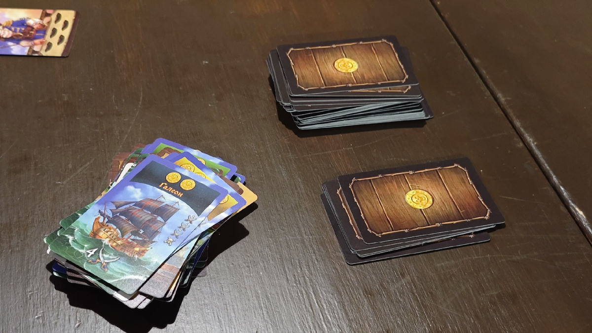 Итак, продолжаю рассказывать вам о наших посиделках с Вадимом, Женей, Любой и Димой! Кто не читал первую часть про великий и могучий Нордгард, велком сюда: Второй игрой стала "Порт Рояль". Это простая карточная игра, в которой в гавань заходят корабли, и вам предстоит нанимать команду. Основная механика игры - это "Проверь свою удачу" (Push your luck). В центре лежит большая колода карт, из которой вы вытягиваете карты. Вытягивать их можно по одной до тех пор, пока вы сами не остановитесь, либо пока вы не вытяните второй корабль уже выложенного цвета. Среди карт можно найти корабли, которые приносят монеты, неожиданные налоги, экспедиции (общие цели), а также различных членов команды, каждый из которых приносит победные очки, а также особые свойства. В свой ход игрок может разыграть от 1 до 3 карт на столе (если выполняет условия), а затем каждый игрок может также разыграть по одной карте, заплатив одну монету активному игроку. Есть ряд персонажей, дающих различные символы. Они необ