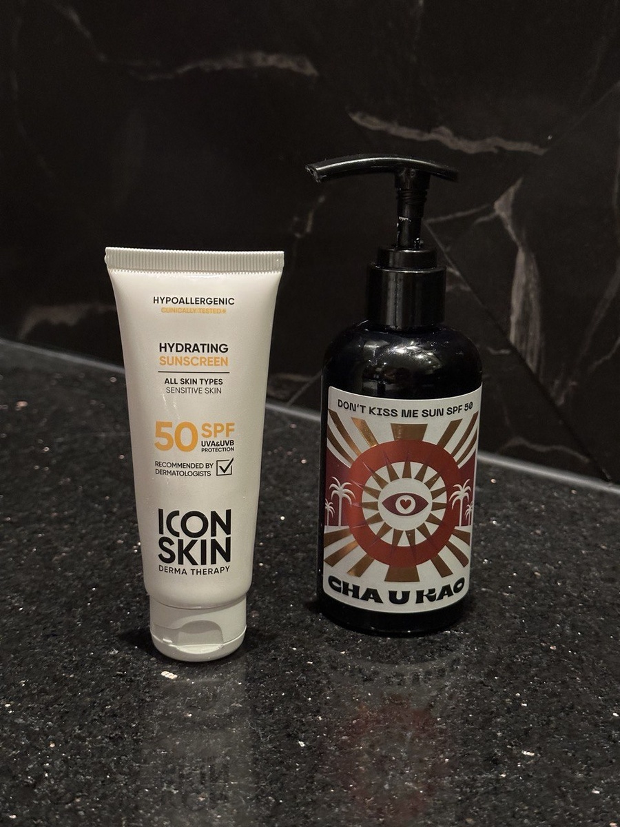В первую очередь, в отпуск выбрала 2 СПФ: одного тюбика нам с мужем не хватило бы на двоих с таким активным солнцем. Icon Skin SPF 50 – плотный увлажняющий крем. Я его использовала утром поверх сыворотки вместо дневного крема, увлажнения хватало.