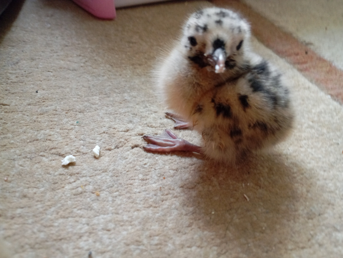 Вчера, когда подходила к школе, увидела такую картину: навстречу по дороге идёт мама с мальчиком 11-ти лет. Мальчик пинает перед собой мячик. Оба идут, улыбаются и смотрят куда-то перед мячиком. Приглядываюсь - а перед мячиком кто-то бежит. Думала - крыса или мышь. Оказалось - птенчик. Мальчик пинал мяч в сторону этого малыша, а он пытался убежать от мячика. А маме с мальчиком было весело смотреть, как страдал малыш. Конечно же, я подобрала малыша. По лапкам, как у утки, поняла, что это птенчик чайки. Голоса чаек я слышала, но далеко. Он оказался на большом расстоянии от предполагаемого места гнездования. Это была дорога, где часто ездили машины. Конечно, я не могла оставить малыша в опасной ситуации. Ждать, пока родители его найдут, тоже не могла, так как не хотела опаздывать на работу. Взяла его с собой. В школе посадила в коробочку, дала попить. С едой была проблема - ничего того, чем я могла бы подкормить малыша, не было. Спустя 2 часа меня отпустили, так как понимали, что птенчик