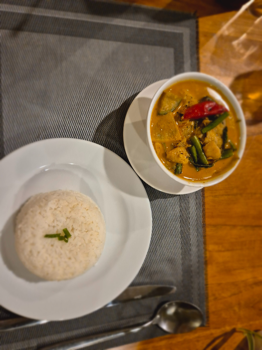 Наше гастрономическое приключение в живописном Ванг Вьенге началось с бодрящих напитков. Я, предпочитая освежающую классику, заказала мохито, а Кирилл решил попробовать самое популярное лаосское пиво – Beerlao. В Лаосе мы часто встречали туристов из Франции, и, зная их любовь к луковому супу, с уверенностью сделали выбор в его пользу. И не ошиблись! Блюдо оказалось интересным не только благодаря традиционному вкусу, но и за счет оригинального дополнения – хрустящих гренок и расплавленного сыра. В качестве главных блюд мы остановились на двух контрастных, но equally восхитительных вариантах. Классическая паста карбонара с générous порциями пармезана и бекона была знакома нам по итальянским ресторанам, но приготовлена она была с особым лаосским шармом. А наше любимое азиатское блюдо – желтое карри с курицей – оказалось настоящим откровением. Мягкая курочка, пропитанная ароматом пряных специй и сливочным кокосовым молоком, буквально таяла во рту. Выбор мяса в этом блюде не ограничив
