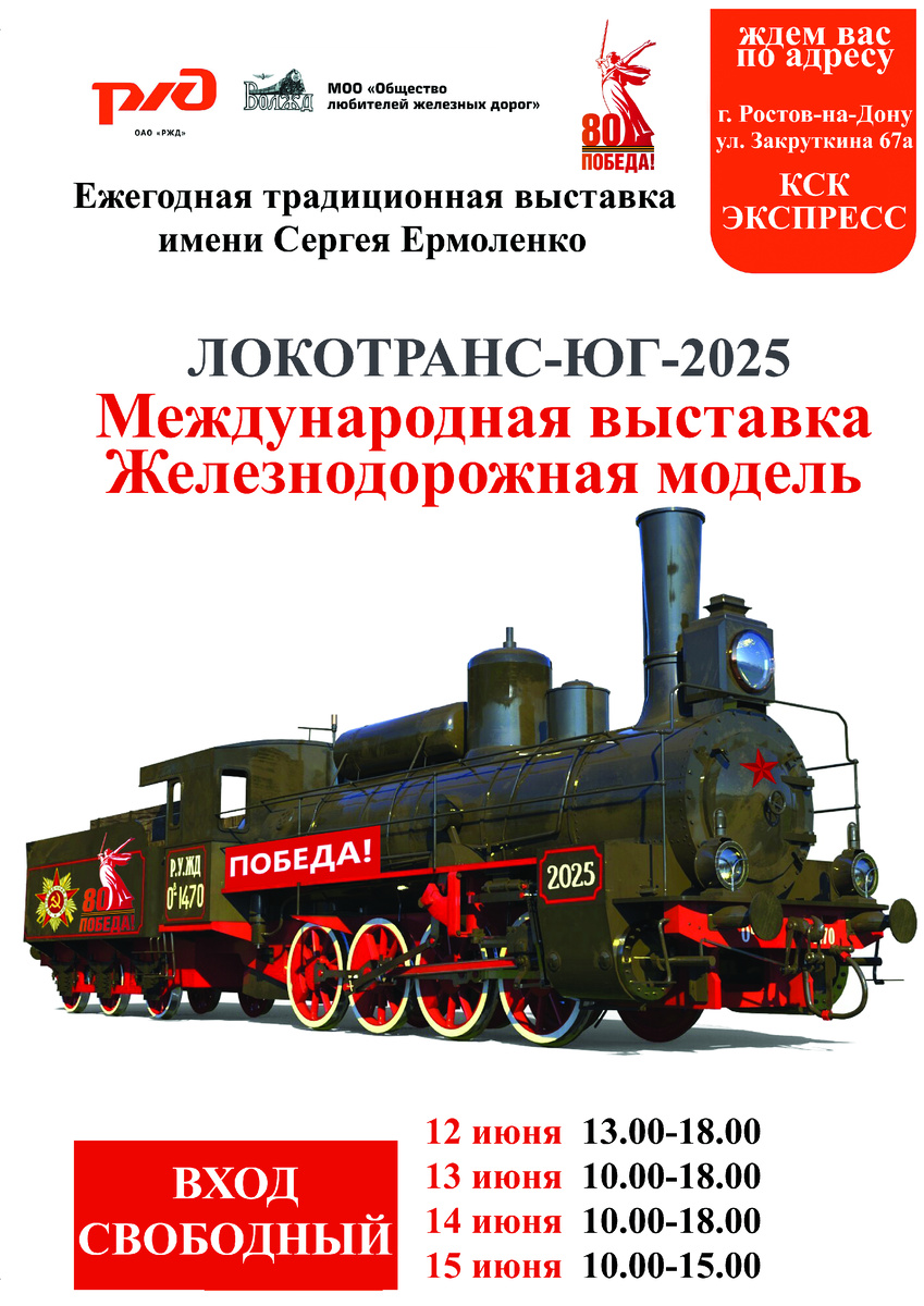 Международная ежегодная выставка железнодорожных моделей "Локотранс-Юг" в городе Ростове-на-Дону в этом году стартует 12 июня и продлится до 15 июня включительно. В этом году мероприятие приурочено к 80-летнему юбилею Победы в Великой Отечественной войне.