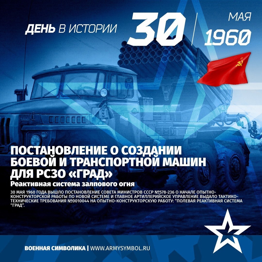 Постановление о создании боевой и транспортной машин для РСЗО «Град» в 1960 Реактивная система залпового огня 30 мая 1960 года вышло Постановление Совета Министров СССР №578-236 о начале опытно-конструкторской работы по новой системе и Главное артиллерийское управление выдало тактико-технические требования №0010044 на опытно-конструкторскую работу: “Полевая реактивная система “Град”. Источник: https://vk.com/wall-60767131_30772 Подпишитесь на наши группы ВКонтакте и в Одноклассниках - читайте, смотрите и комментируйте! Источник