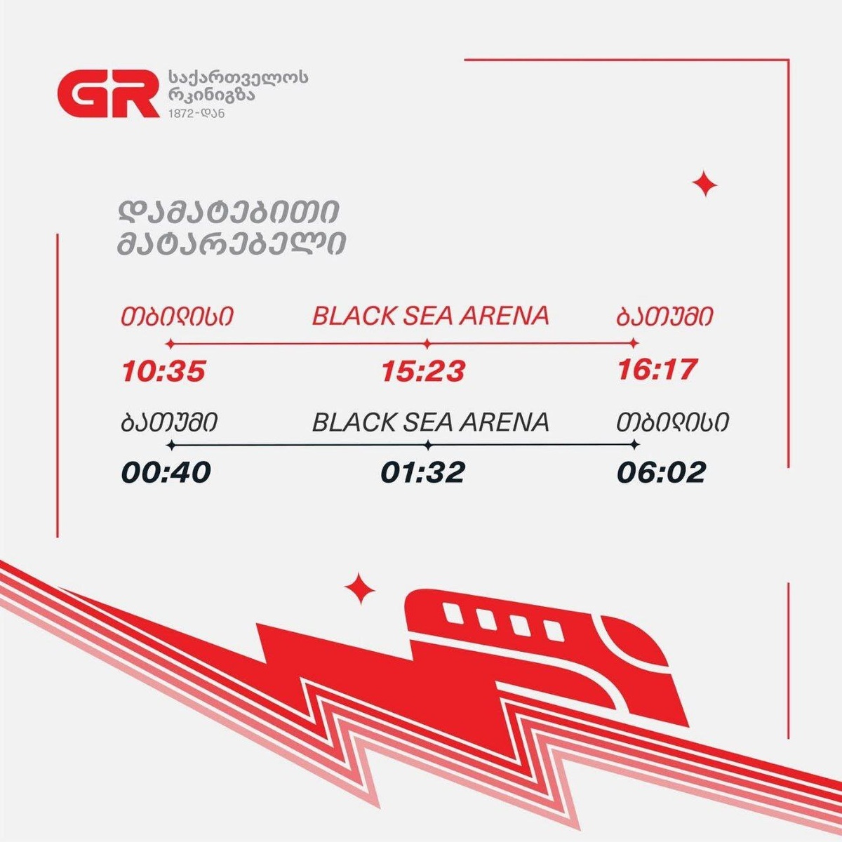 30 мая в рамках Black Sea Arena Starring Georgia для желающих посетить концерт Guns N' Roses будет запущен дополнительный поезд на направление Тбилиси - Black Sea Arena - Батуми. Билеты можно приобрести здесь: ✅ На сайте https://gr.com.ge ✅ В грузинских ж/д кассах
