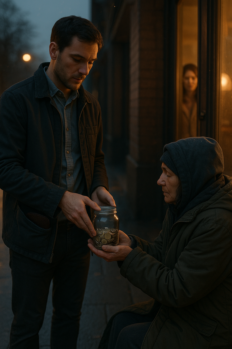 Мария стояла, как остаток дыма. Ларьковая лампа подсвечивала ободок банки, каждый медяк казался крошечным солнцем.