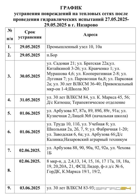 ⚡️⚡️⚡️⚡️Горячую воду вернут не всем: энергетики озвучили результаты гидравлических испытаний в городе Назарово Не все сети выдержали проверку на прочность. Но аварийные бригады уже приступили к устранению дефектов. Отмечается, что на это потребуется некоторое время. Пока, согласно графику устранения повреждений, эти работы планируют завершить до 10 июня. «Обращаем ваше внимание, что указанные сроки являются предварительными и могут измениться из-за технологической сложности устранения дефектов. Постараемся максимально быстро вернуть всем назаровцам горячую воду. Благодарим за понимание. Мы готовим город к зиме», — предупреждают население энергетики.