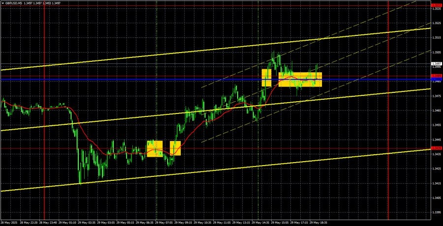 https://basechop.ru/wordpress/?p=44603 Анализ GBP/USD 5М. Валютная пара GBP/USD в четверг показала меньшую волатильность, чем пара EUR/USD, что довольно удивительно. В то же время британский фунт без особых проблем восстановился к критической линии по тем же причинам, что и европейская валюта возобновила свой рост. Нет смысла заново описывать все, что произошло вчера в Штатах. Скажем лишь, что рынок в очередной раз не поверил ни Трампу, ни суду, ни в чудесные перспективы американской экономики при Трампе, ни в завершение торговой войны. Поэтому суммарно мы увидели новое падение доллара, а технический выход цены за пределы трендового канала был перекрыт фундаментальным фоном и очень своеобразной интерпретацией его трейдерами. Впрочем, мы говорили в последних статьях о том, что даже при закреплении ниже восходящего канала поверить в сильный рост доллара в текущих обстоятельствах очень сложно. Вчера цена еще и от линии Сенкоу Спан Б отскочила, что особенно хорошо видно на 4-часовом ТФ.…