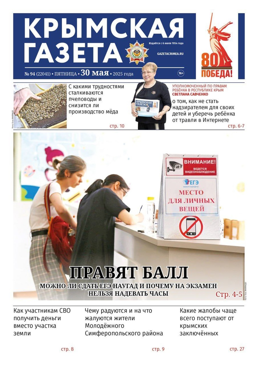 Читайте в свежем номере "Крымской газеты": ШКОЛЬНАЯ ПОРА. Можно ли сдать ЕГЭ наугад и почему на экзамен нельзя надевать часы КТО НАС КОРМИТ. С какими трудностями сталкиваются пчеловоды и снизится ли производство мёда НОВАЯ ВЫПЛАТА. Как участникам спецоперации получить деньги вместо участка земли ЗА КОЛЮЧЕЙ ПРОВОЛОКОЙ. Какие жалобы чаще всего поступают от крымских заключённых