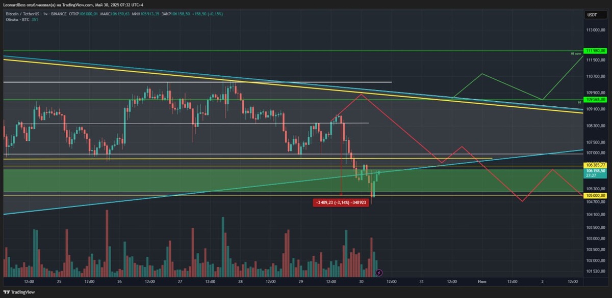 В ответ на пост #BTC 🕯Локально🕯 ⚠️Всем привет! Итак, график 1Н ТФ, сценарий вчера начал отработку на пару часов раньше запланированного времени)), ровно после поста о такой вероятности. Прямо сейчас мы наблюдаем продолжение реализации и подтверждение моих мыслей, а именно пробой трендовой (нижней границы треугольников), погружение в блок к нижней его границе уровня 105К и ответная реакция блока = собственно поддержка! ММ опять стащил мой план!)) P.s. что дальше?? Во-первых, быть предельно осторожным ввиду повторного ретеста сегодняшнего Low и распил блока, прежде, чем график вернется обратно в треугольник. Во-вторых, нельзя исключать продолжение сценария снижения, хотя за ночь ликвиднули почти 800млн$, отличный урожай. Сейчас самые жирные ликвидации по BTC находятся в зоне уровней 107-110К, как раз диапазон треугольника до верхней границы. В-третьих, сегодня пятница и там, где день сегодня закроется, вероятно там и тормознемся, как минимум на выходные. Если закроемся над блоком =