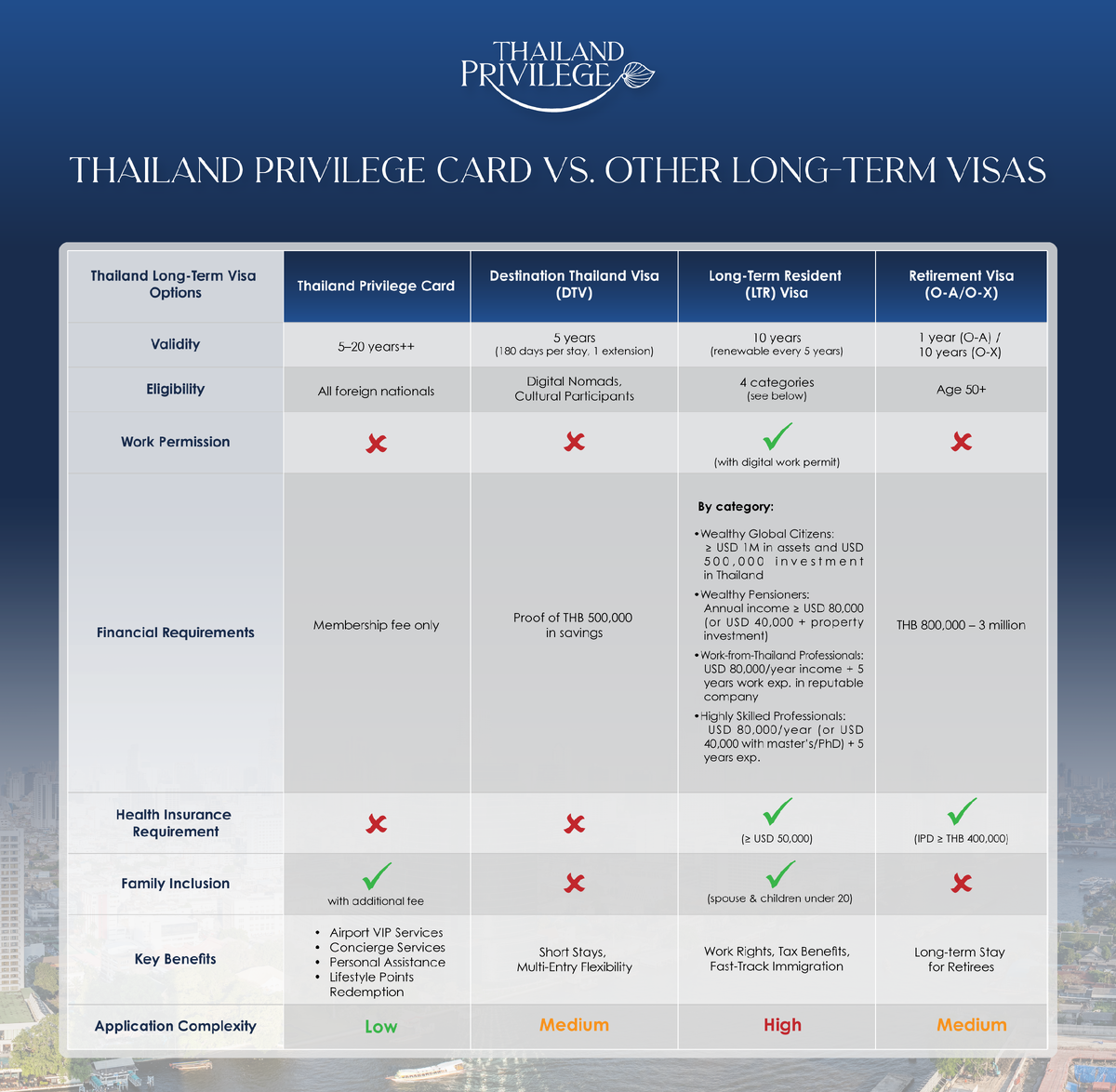 Хотя каждая долгосрочная виза в Таиланде имеет свои цели, Thailand Privilege Card выделяется удобством, гибкостью и преимуществами в стиле жизни — это идеальный выбор для тех, кто ценит время, комфорт и премиальный уровень проживания.