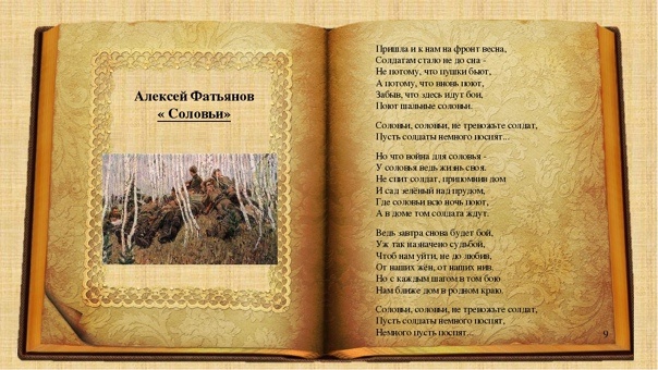 Сам Алексей Фатьянов так рассказывал о том, как были созданы слова будущей песни «Соловьи», которая в изначальном варианте имела название «Пришла и к нам на фронт весна»: «Помню фронт. В большой зелёной роще мы, солдаты, после только что затихшего боя лежим, отряхиваясь от крупинок засыпавшей нас земли, и вдруг слышим: вслед за растаявшим вдали рокотом вражеских самолётов, во всё горло, как бы утверждая жизнь, защёлкал соловей!».