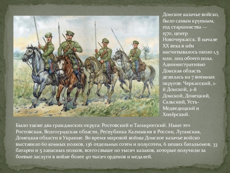 С началом 1 Мировой войны Донское казачье войско выставило: 2 гвардейских полка, 60 казачьих полков,136 отдельных сотен и полусотен, 6 пеших батальонов, 33 батареи.