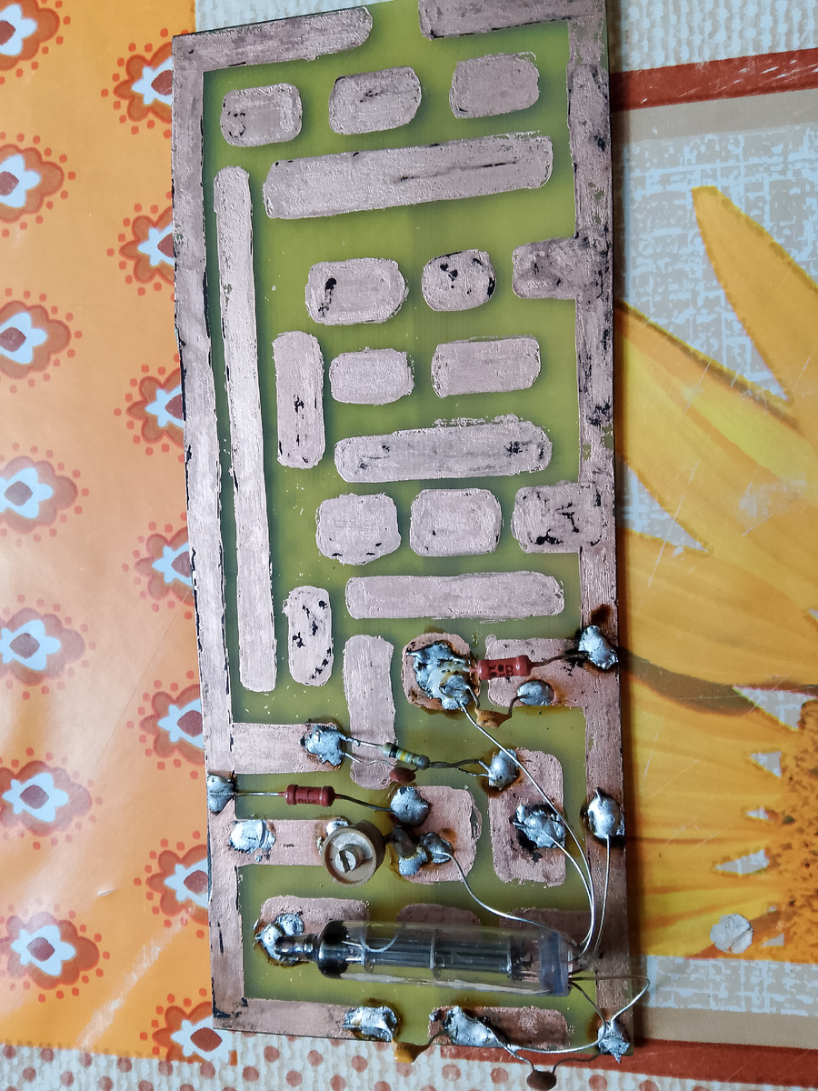 вот так проходит сборка фм приемника на стержневой радиолампе.высокочастотный каскад практически готовый.частотный детектор скорее всего сделаю на диодах 1n4148.хотя у меня есть и высокочастотная лампа диод.на выходе в качестве узч,будет или лампа 1ж24б или же 2-3 транзистора.транзисторы если все таки поставлю в узч,то подключаю их через делитель напряжения.чтоб снизить напряжение с 80 вольт для радиолампы,до приемлемых для транзисторов 1.5-4.5 вольт сделаю делитель напряжения для питания узч на транзисторах.