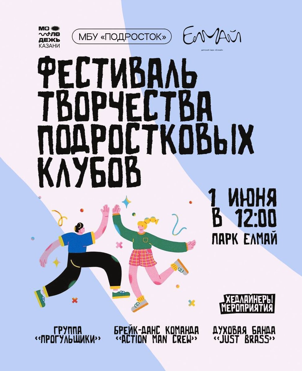 🎉 Фестиваль творчества подростковых клубов — яркое событие этого лета! 🗓️ 1 июня ⏰ 12:00 💸 бесплатно 📍 Парк Елмай Весь день гостей ждёт множество разнообразных зон с мастер-классами и активностями. Всё это — бесплатно и для всех желающих! В программе также спортивные игры, творческие задания и захватывающий DJ-сет на закате. ➡️ ПОДРОБНОСТИ ⬅️ ❗️ Детская Афиша | Казань Больше информации в нашей группе, переходите