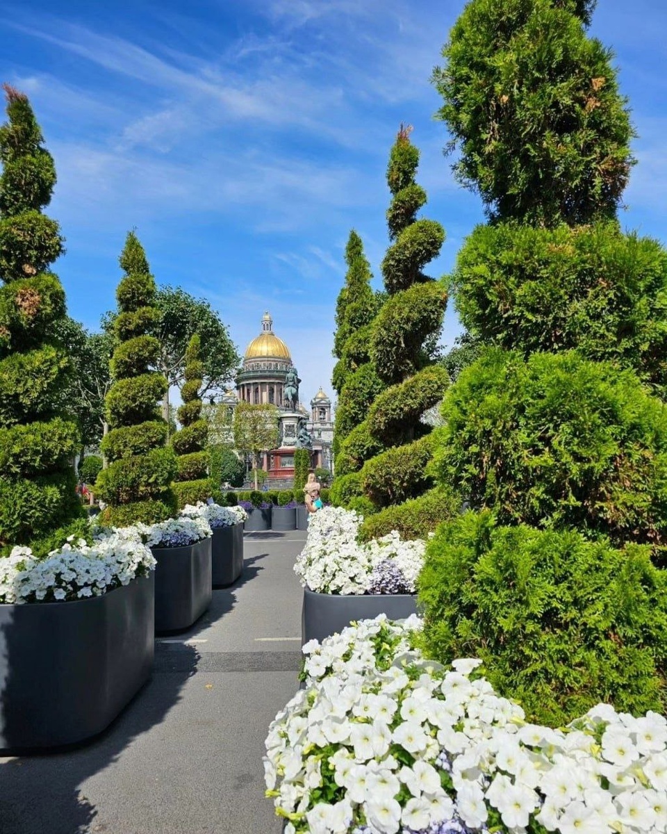 На Исаакиевской площади открылся сад-трансформер Ко Дню города на Синем мосту перед Мариинским дворцом обустроили зеленую зону. Здесь установили контейнеры с 170 деревьями (липами и туями различных форм). Также в саду разместили 2,5 тыс. кустарников и более 5 тыс. цветов, в том числе гортензии, розы, вейгелы, самшит, лапчатку и лаванду.